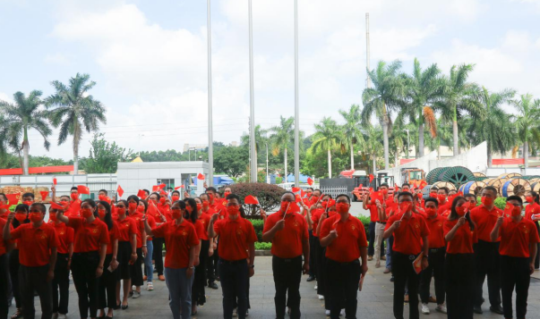 盛夏七月,热情似火!币游国际公司已是党旗飘扬,处处洋溢着喜庆祥和的气氛。当日上午,身穿“中国红”T恤的党员等参会人员有序入场,列队数字“100”庆祝图案,表达对中国共产党的无限热爱。随着主持人一声令下,伴随着激昂雄壮的国歌声,护旗手奋力将鲜艳的五星红旗抛向天空,国旗迎着清晨第一缕阳光冉冉升起,全体人员庄重注视国旗,高唱国歌,脸上写满了骄傲与自豪。